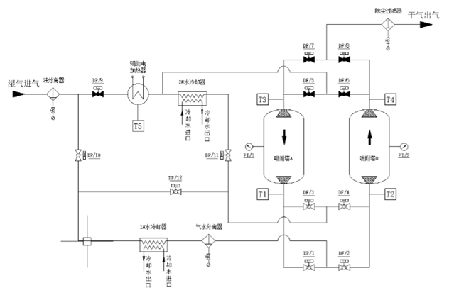 电解水制氢是一种较为方便的制取氢气的方法。在充满电解液的电解槽中通入直流电,水分子在电极上发生电化学反应,分解成氢气和氧气。通电后,电解池阴极产氢气,阳极产氧气,氢气进入氢/水分离器,氧气进入氧/水分离器。氢、氧经过初步除水后,分别进入氢气干燥器和氧气干燥器进行干燥。干燥器采用加热再生闭式循环,全流量冷吹,零排放,加热再生采用分流工艺,无需鼓风机等动力设备,工艺先进安全节能且露点稳定。