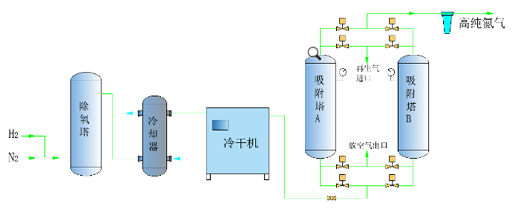 加氢纯化装置:加氢型氮气纯化采用贵金属钯为催化剂,氮气中的氧气和氢气在一定温度和催化剂中反应生成水并除去而使氮气纯度达到99.9995以上的一种气体纯化方式。它是一种氮气终端纯化装置。
