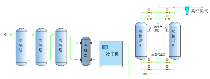 加碳纯化装置:在以活性炭为载体的脱氧剂,一定温度下,与氮气中的残余氧气发生化学反应生成二氧化碳,再经吸附干燥工艺除去原料氮气中的CO2及水份,从而得到99.9995%纯度以上的氮气。