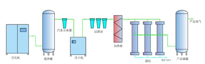 空气经过空压机提压后,进入多段过滤器,除去粉尘、油、水后,洁净空气进入膜组件进行氧氮分离。一级膜分离制氧得到的氧气纯度为40%左右,对于氧纯度要求高的,可以多段膜进行串联。